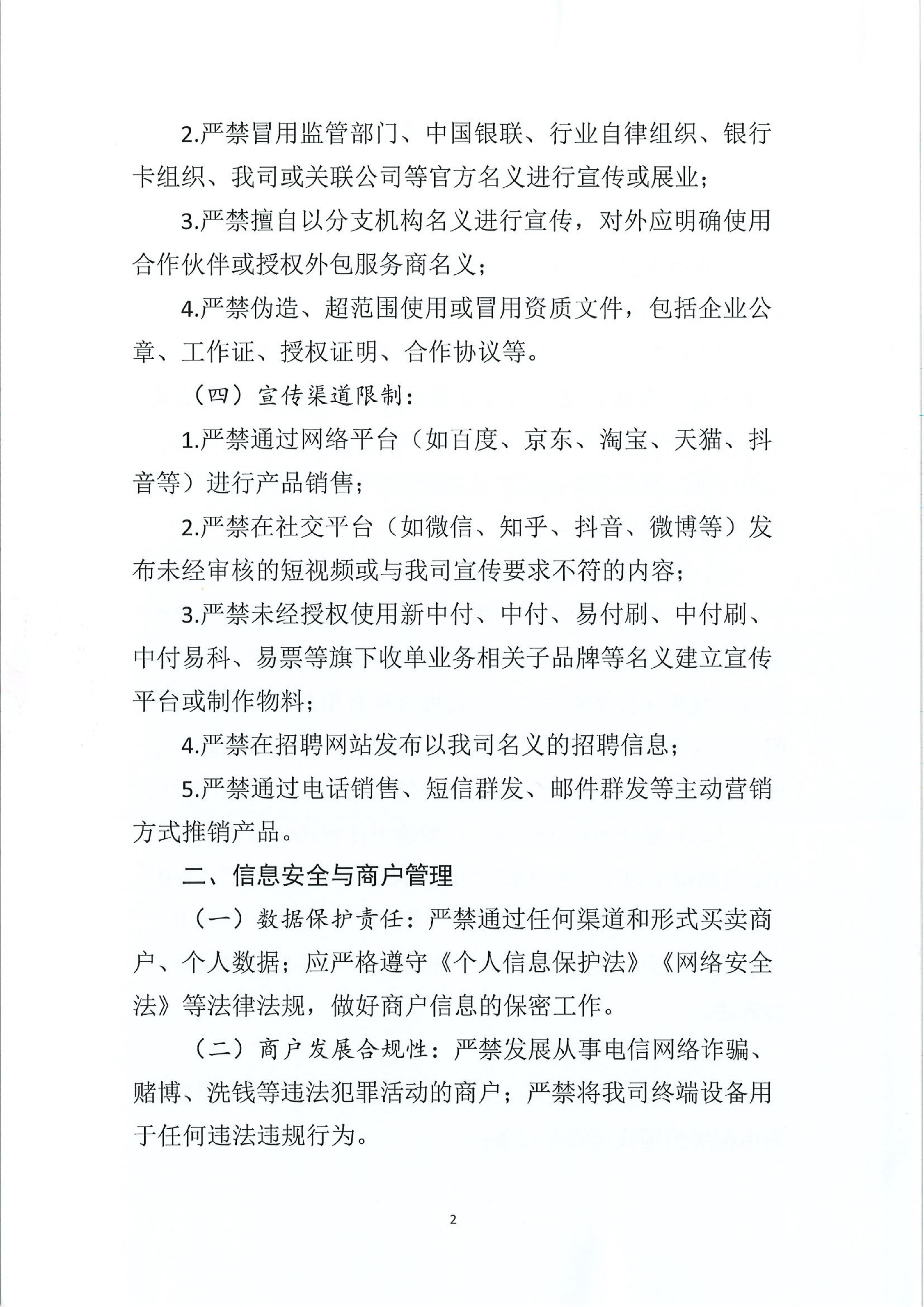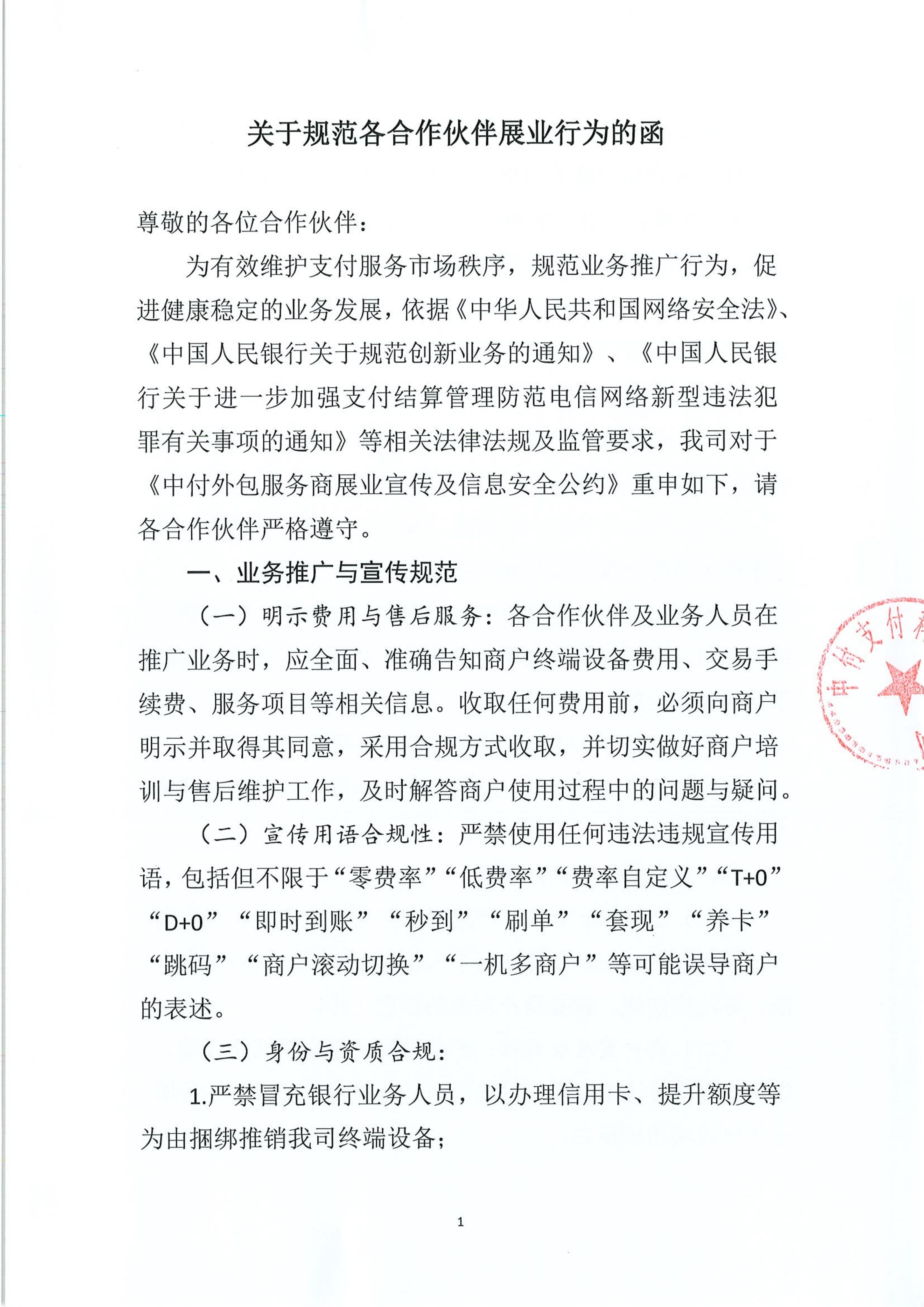 为有效维护支付服务市场秩序,规范业务推广行为,促进健康稳定的业务发展,依据《中华人民共和国网络安全法》、《中国人民银行关于规范创新业务的通知》、《中国人民银行关于进一步加强支付结算管理防范电信网络新型违法犯罪有关事项的通知》等相关法律法规及监管要求,我司对于《中付外包服务商展业宣传及信息安全公约》进行重申